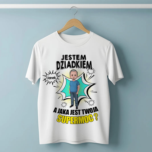 Koszulka personalizowana dla dziadka JESTEM DZIADKIEM, A JAKA JEST TWOJA SUPERMOC? | zabawny motyw z personalizacją imienia #212