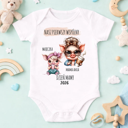 Koszulka personalizowana dla mamy i córki NASZ PIERWSZY WSPÓLNY DZIEŃ MAMY | rodzinny motyw z uroczymi świnkami #7841