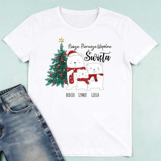 Koszulka personalizowana rodzinna NASZE PIERWSZE WSPÓLNE ŚWIĘTA | świąteczny motyw z choinką i niedźwiadkami #116