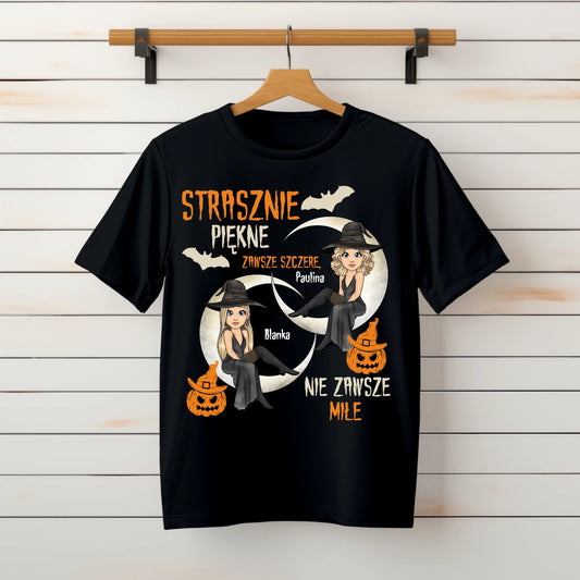 Halloweenowa koszulka personalizowana dla przyjaciółek STRASZNIE PIĘKNE ZAWSZE SZCZERE | motyw z wiedźmami #311