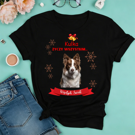 Świąteczna koszulka personalizowana ŻYCZY WSZYSTKIM WESOŁYCH ŚWIĄT | motyw z psem #0412