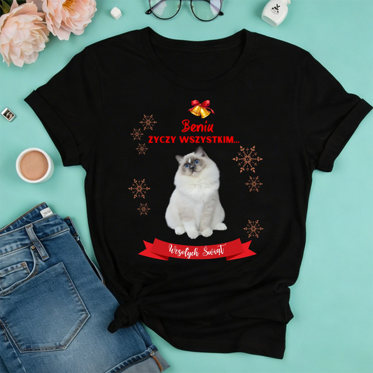 Świąteczna koszulka personalizowana ŻYCZY WSZYSTKIM WESOŁYCH ŚWIĄT | motyw z kotem #0312