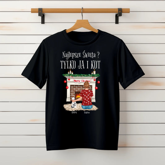 Świąteczna koszulka personalizowana TYLKO JA I KOT | motyw z kotem przy kominku #120