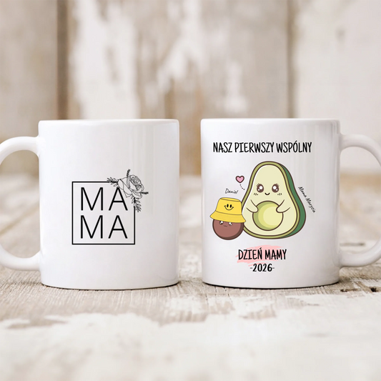 Kubek personalizowany dla mamy i dziecka NASZ PIERWSZY WSPÓLNY DZIEŃ MAMY | motyw z awokado #571