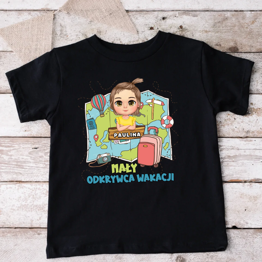 Koszulka personalizowana dla dziecka MAŁY ODKRYWCA WAKACJI | wakacyjny motyw z mapą świata #7