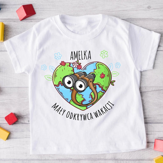 Koszulka personalizowana dla dziecka MAŁY ODKRYWCA WAKACJI | wakacyjny motyw z lornetką #722