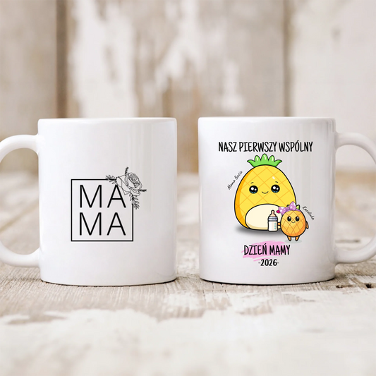 Kubek personalizowany dla mamy i dziecka NASZ PIERWSZY WSPÓLNY DZIEŃ MAMY | motyw z ananasami #573